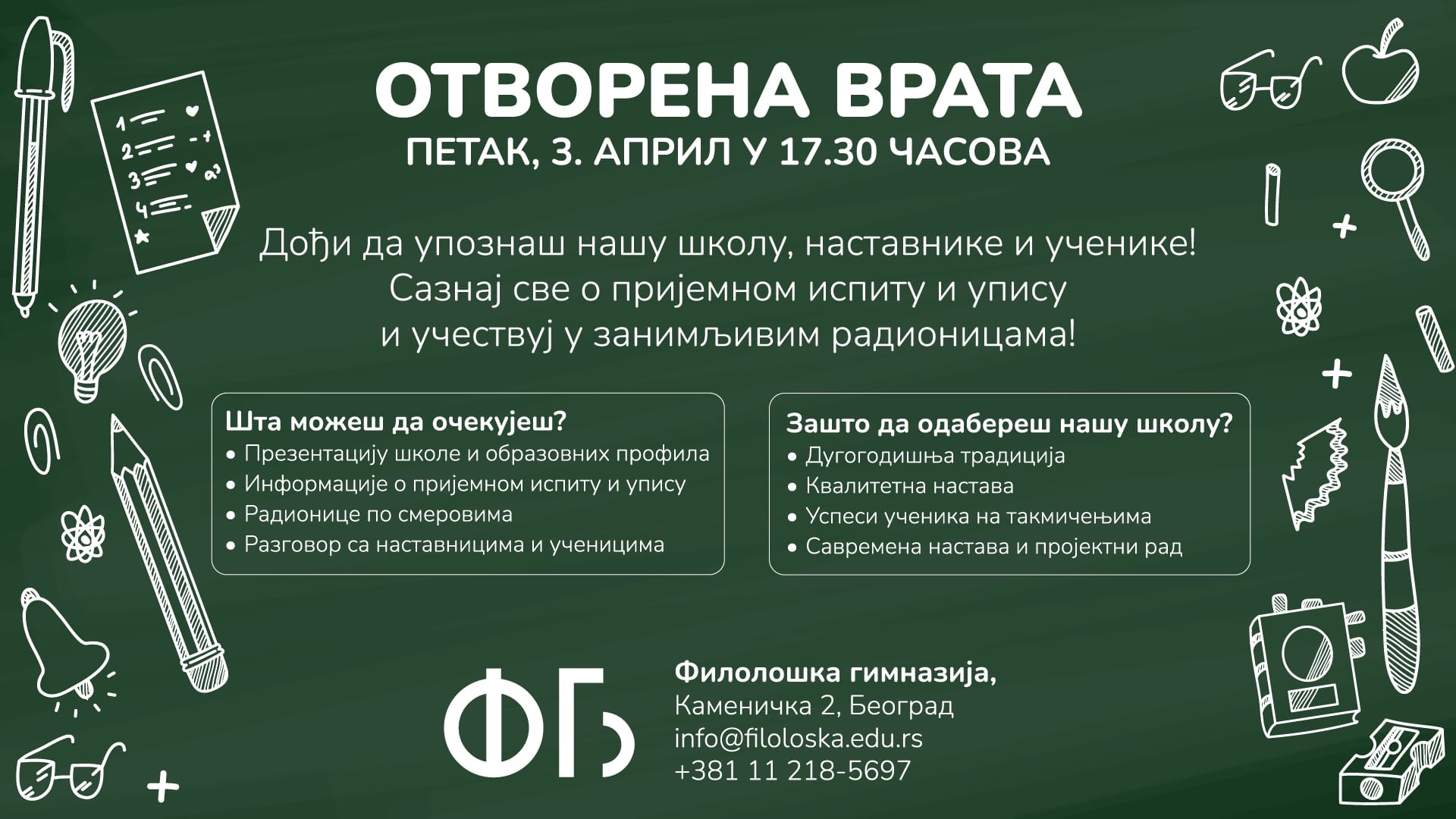 У случају евентуалних недоумица у вези са пријавом за пријемни испит можете се обратити на следећу имејл адресу: info@filoloska.edu.rs